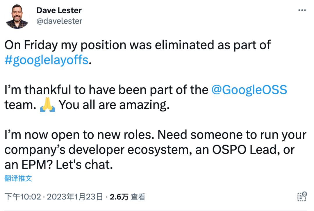 「星期五,我的职位作为#googlelayoffs 的一部分被取消了」,主要负责 Google 的开源安全计划的新员工 Dave Lester 如是说道。与此同时,他也在 Twitter 上开启应聘模式,“我现在对新岗位持开放态度。有需要招聘运营开发者生态系统、OSPO 主管、EPM 的公司?我们可以聊聊。”