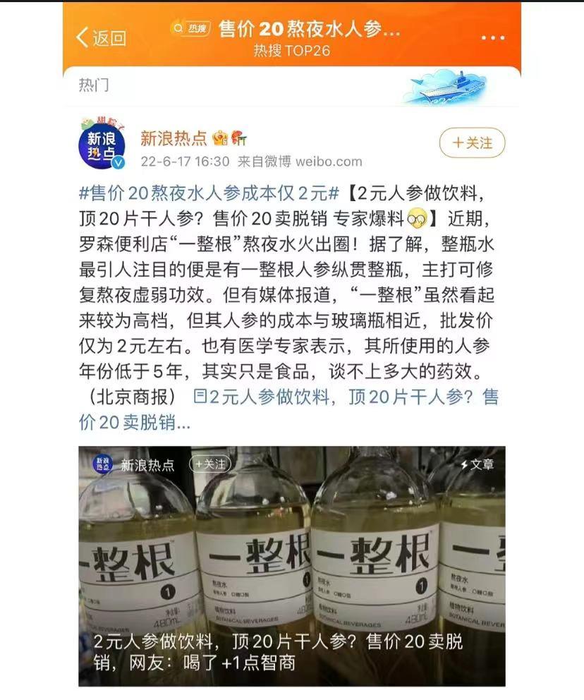 人参水的作用是针对熬夜人群起到提神的作用,为一种补偿性饮料,与其叫“熬夜水”,不如叫“提神水”,尽管后来一整根实现了“去熬夜化”,但网络上关于一整根熬夜水的相关信宣传仍在发酵。