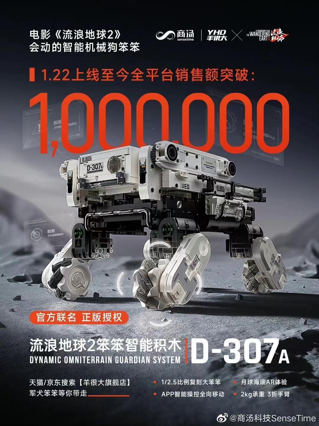 其中,机器狗笨笨周边尤其受欢迎,拼装版销量已超12万,成品版销量则超2.5万。商汤科技生产的笨笨智能积木在淘宝旗舰店上的销量已经超过3000台,按其899元的单价计算,销售额已经突破269.7万元,商汤科技的股价也迎来了约20%的上涨。
