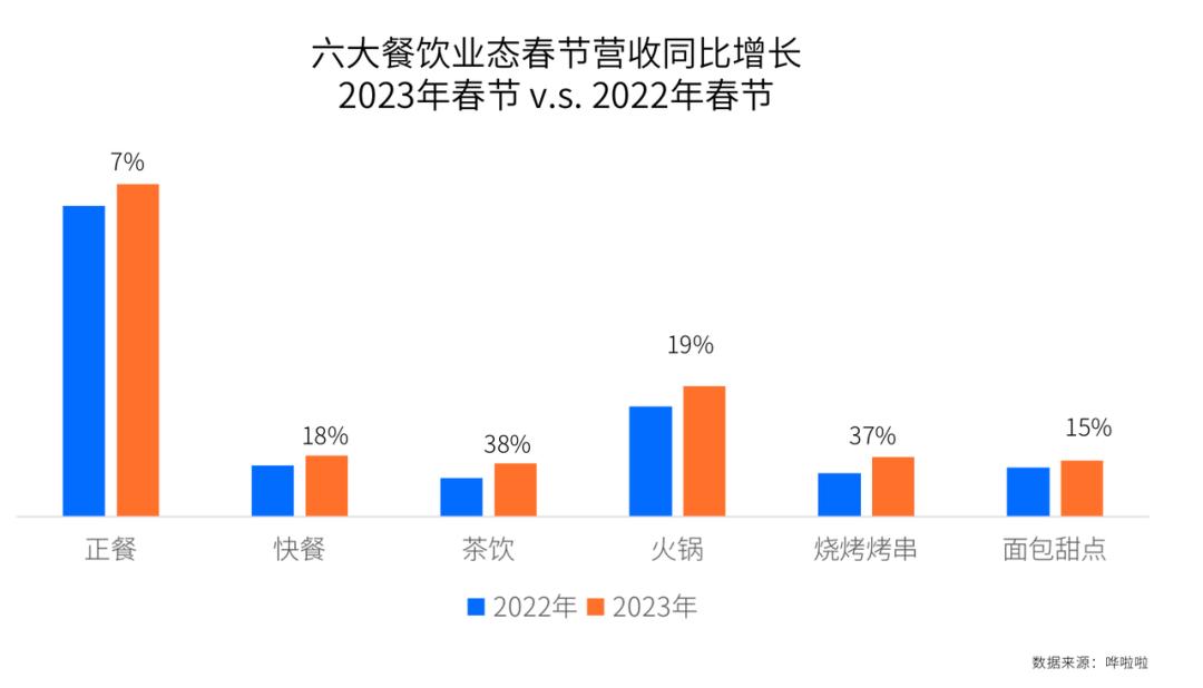 哗啦啦的数据同样表明,2023年春节期间,茶饮企业店均营收相较于去年同期增长了38%,位于六大餐饮业态的首位,紧随其后的烧烤烤串业态同比增长37%,而正餐业态仅有7%的增长,名列末位。
