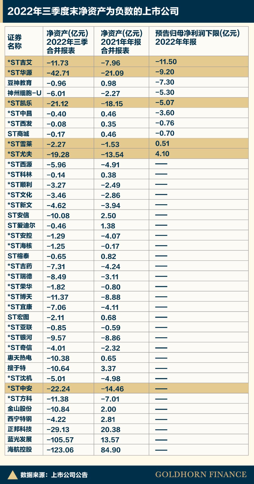 比如已经戴星的*ST华源、*ST中安、*ST凯乐,在2021年末净资产已为负数,2022年净资产进一步恶化,三季度末均小于-20亿元。
