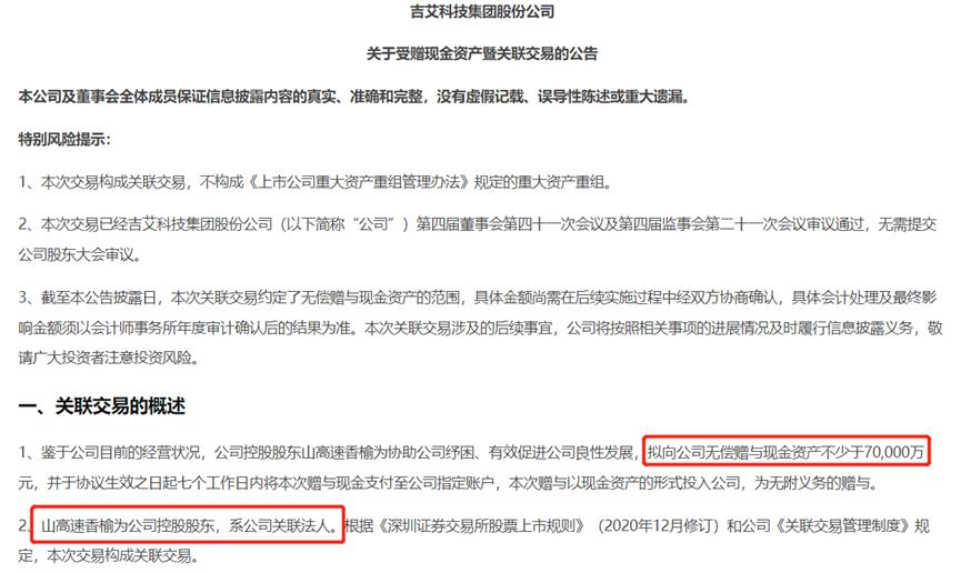 然而,去年末*ST吉艾突发公告称,新控股股东山高速香榆无偿赠与不低于7亿元现金资产,并称该赠与无附义务和不可撤销。