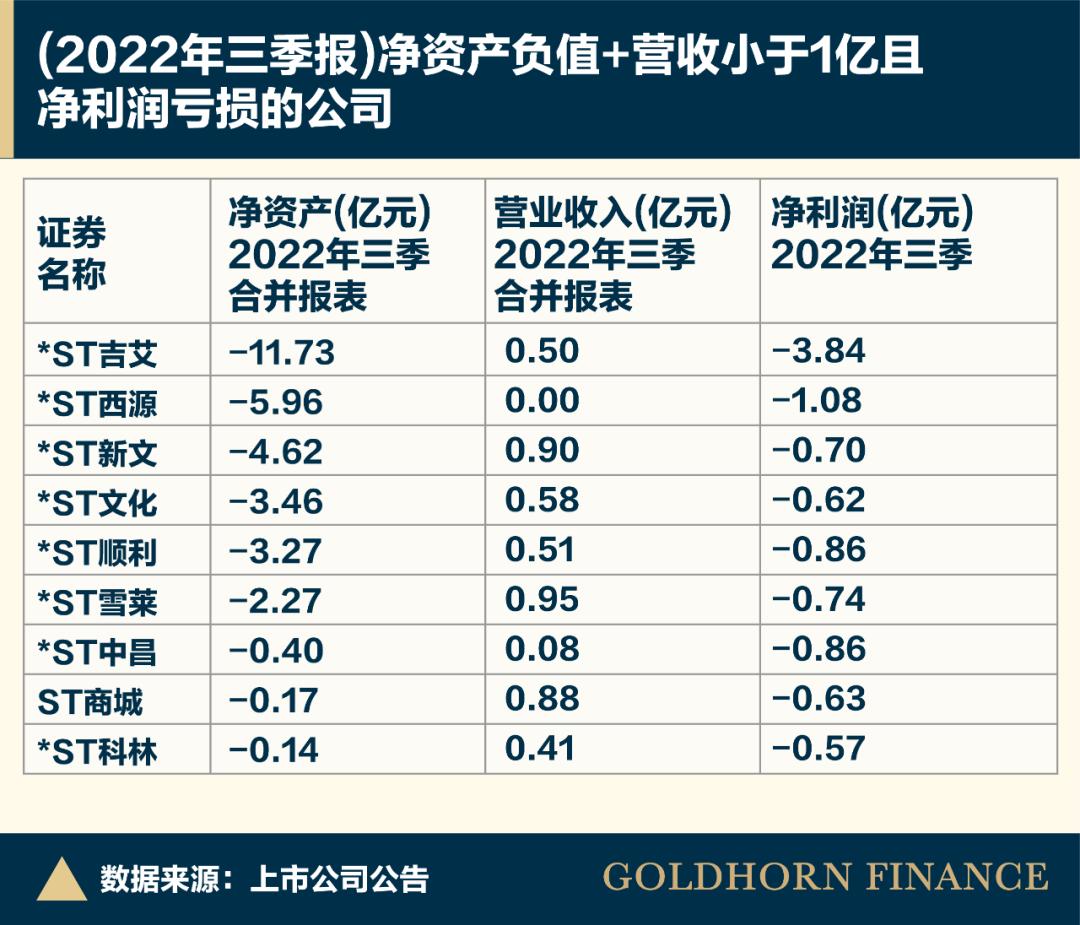 比如此前已连续三年亏损的*ST吉艾,2022年三季度末的营业收入、扣非净利润和净资产分别为0.5亿元、-3.71亿元和-11.68亿元。