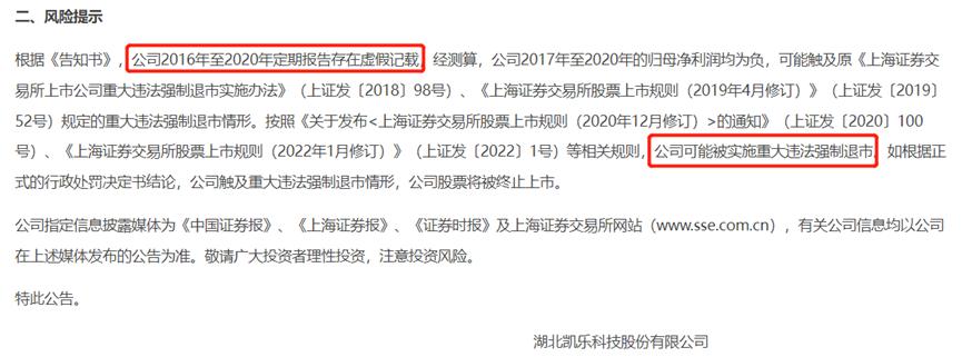 *ST凯乐去年末公告称,公司可能被实施重大违法强制退市。据证监会资料,*ST凯乐连续五年财务造假,累计虚增营业收入512.25亿元,虚增利润总额59.36亿元,2017年至2020年的归母净利润实则均为负。