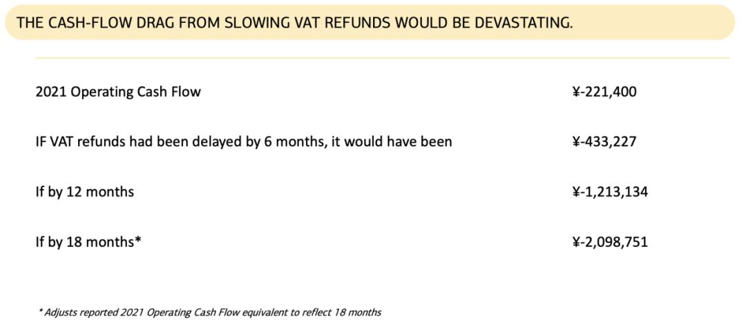 “YMM的增值税套利意味着该公司必须预先支付大量现金,以支付政府所需的9%,同时容忍在增值税退款到来之前的长时间滞后。缓慢的退款意味着对运营资本的巨大拖累。我们估计公司将需要额外的 20亿美元来应对18个月的延迟。”