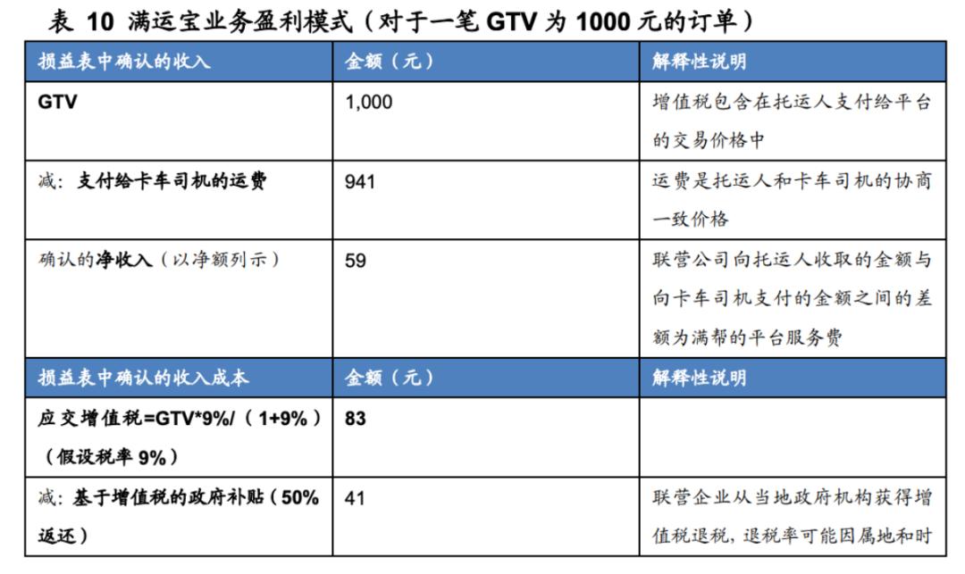 从无车承运业务的具体盈利模式来看,以GTV口径1000元的订单为例。满帮收取5.91%的服务费(2021年服务费率)确认为净收入,若不考虑其他税项,仅考虑最主要的增值税,平台需要负担销项增值税83元(增值税率9%),政府通过税收返还的形式补贴41元,平台成本确认增值税42元,则该项业务最终产生利润17元,毛利率为28.8%。