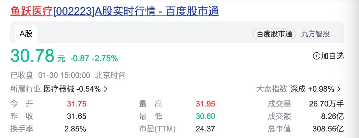 2023年1月30日收盘,鱼跃医疗股价跌至30.78元。较2022年11月曾有过的42元高点,下跌了25%。