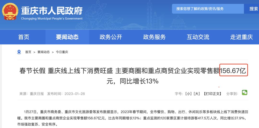 据重庆市商务委消息,春节期间,重庆主要商圈和重点商贸企业实现零售额156.67 亿元,比去年同期增长13%(注:因统计口径不同,截止目前为止和商业有关的数据最高消费为重庆)。