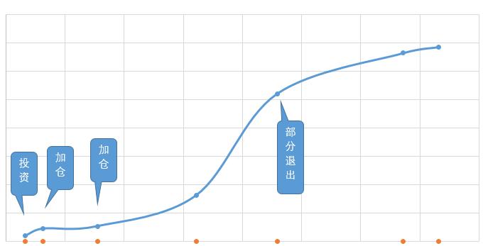 比如我们投资的一个大芯片公司,过去几年的估值曲线如下图,我们在估值拐点前3次的增资中均投资并不断提高股比,在估值曲线拐点后,估值增长有所放缓时部分退出。