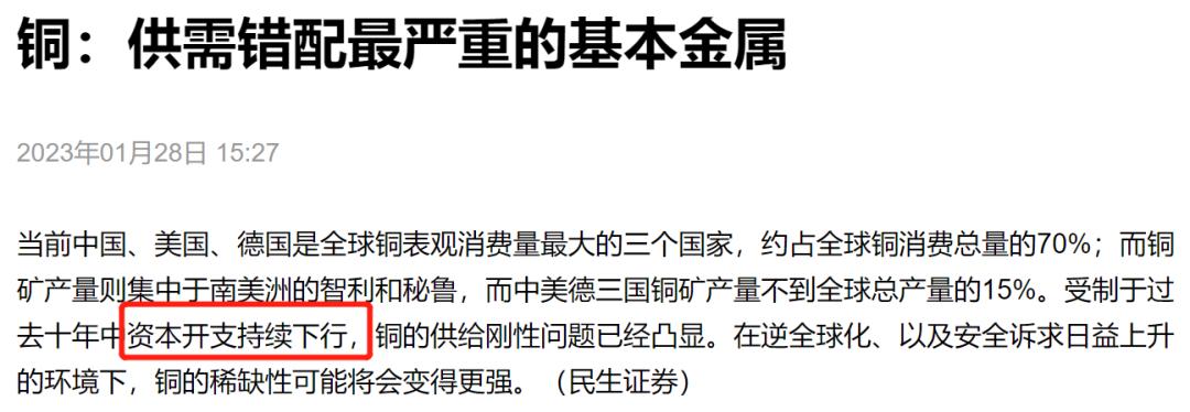 这个意味着短期供给会偏紧,长期的话要看全球铜矿的产量,有一个数据,2022年前三季度全球铜矿累计产量1600万吨,同比仅增长1.2%,另外有券商提到过去10年,铜矿的资本开支持续下行,严重影响未来的供给。