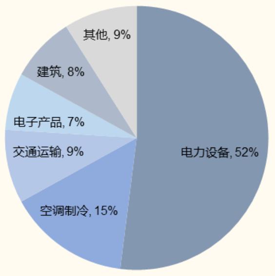 翻看研报,国内铜主要用在这些行业,其中电力设备行业占比过半。