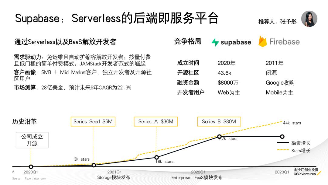 Supabase并非创造新的需求,而是捕捉到SQL重新崛起逐渐替换NoSQL,以及JAMStack开发范式的趋势,用开源来挑战后端即服务(BaaS)领域的De facto Firebase。借助Postgres相比Firestore的优势以及Angular等JAMStack开源社区的力量,Supabase快速飞跃PMF的鸿沟,直接在明确的市场需求中打磨竞争策略。