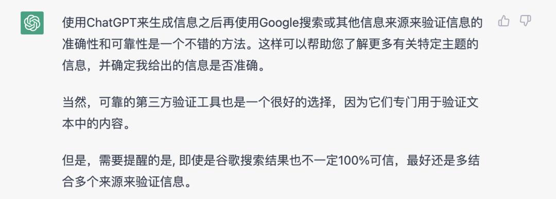 如果我们问ChatGPT:“是不是可以先用ChatGPT获得答案,然后再去Google验证信息?”它也会认可这是个不错的方法,虽然调侃了它的无中生有,但它的回复的思维逻辑又无懈可击。