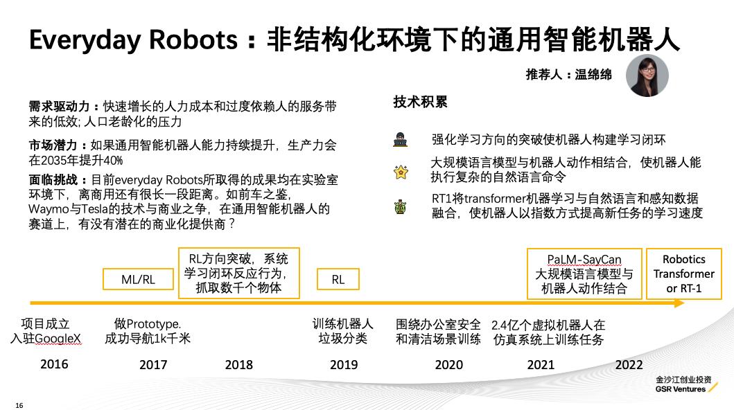 推荐理由:22年大规模语言模型的突破也给通用智能机器人赛道带来重大效果的提升,Everyday Robots不仅能执行复杂自然语言命令,且学习速度正以指数方式提升。