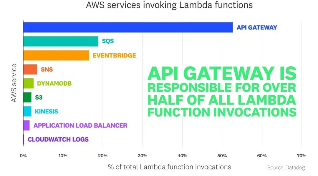 一般而言,越简单的东西越容易进行Serverless改造,从Datadog的一项AWS Lambda客户的用户调研中可以看到,超过50%的Lambda函数都是服务于API网关,而剩下的又有40%左右是服务于各项消息的应用例如SQS(Simple Queue Service,消息队列服务),Eventbridge还有SNS(Simple Notification Service,简单提醒服务)。同时在这些API网关的调用中,又有超过80%的调用是单一目标函数(Single Purpose Lambda Function),一方面单一目标函数是相互之间独立调试与部署的,也可以使用更为清晰的IAM Role来进行管理,能够最大限度地发挥Function的价值而不增加额外的开发负担。