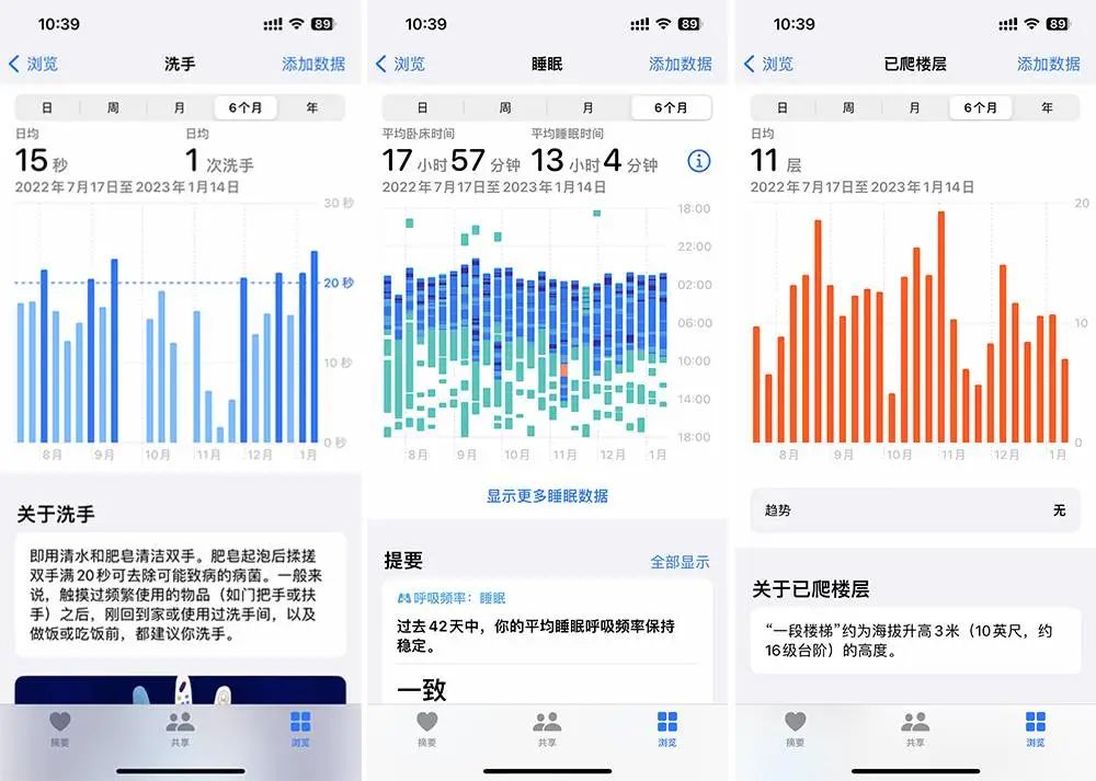 健康记录最大的更新应该就是睡眠记录了。watchOS 9 终于可以记录深度睡眠以及睡眠比较图表,从而更加全面的了解睡眠状况。