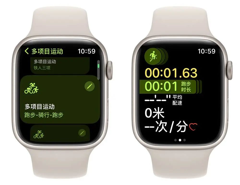 在 watchOS 8 中,我们进行跑步、骑车等运动时,Apple Watch 会自动识别,watchOS 9 更进一步,选择「多项目运动」,你就可以在游泳、跑步、骑行之间自动切换,记录更加方便。