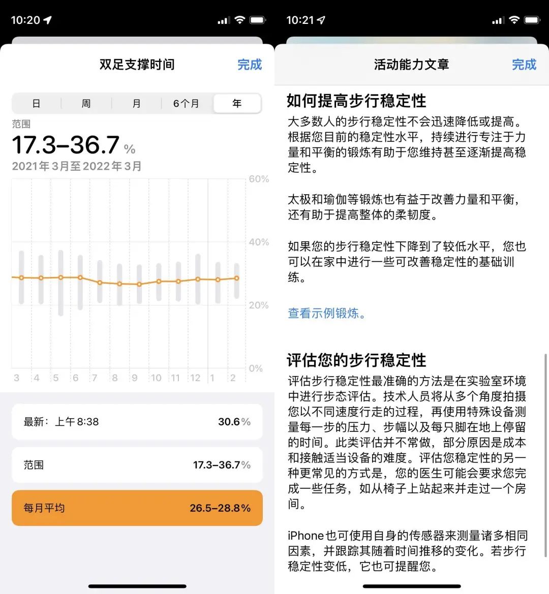 然而步长不仅能反映一个人的身高。加入时间因素,便能看出其步行时的步幅变化,《健康》会同时统计最小和最大步长。步长与上一项步伐不对称性一样,都是通过 iPhone 测得的。