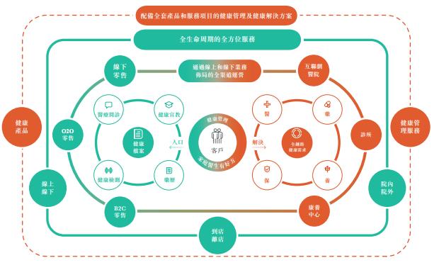 公司通过全渠道零售网络提供全面覆盖客户全购买周期的全方位产品及服务,整合的产品及服务可满足客户涵盖整条医疗卫生产业链的医、药、养、保等要素的全链路健康管理需求。