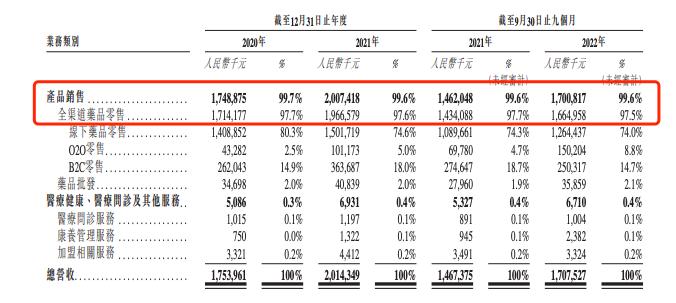 截至2020年及2021年12月31日止年度以及截至2021年及2022年9月30日止九个月,公司全渠道药品零售业务的营收分别占总营收的97.7%、97.6%、97.7%及97.5%。