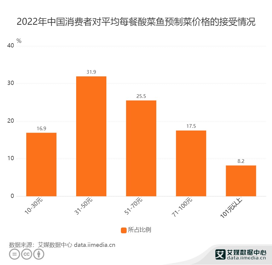 据媒体报道,假期内各餐馆年夜饭预订火热,其中包厢更是紧俏,大厅用餐价格一般从1200元左右起步,包厢消费则达到1800元甚至更高。反观预制菜,在性价比就跑赢一局,以酸菜鱼为例,艾媒咨询数据显示,在2022年消费者对平均每餐酸菜鱼预制菜价格的接受情况中,31.9%消费者会选择31-50元,25.5%消费者会选择51-70元,会选择101元以上的比例只有8.2%。