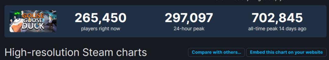 在《Among Us》之后《鹅鸭杀》无疑把“xx杀”这类游戏又卷火了一个台阶。Steam DB显示,《鹅鸭杀》最高在线人数为70万,远超《Among Us》的44万。