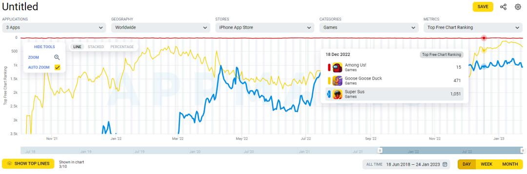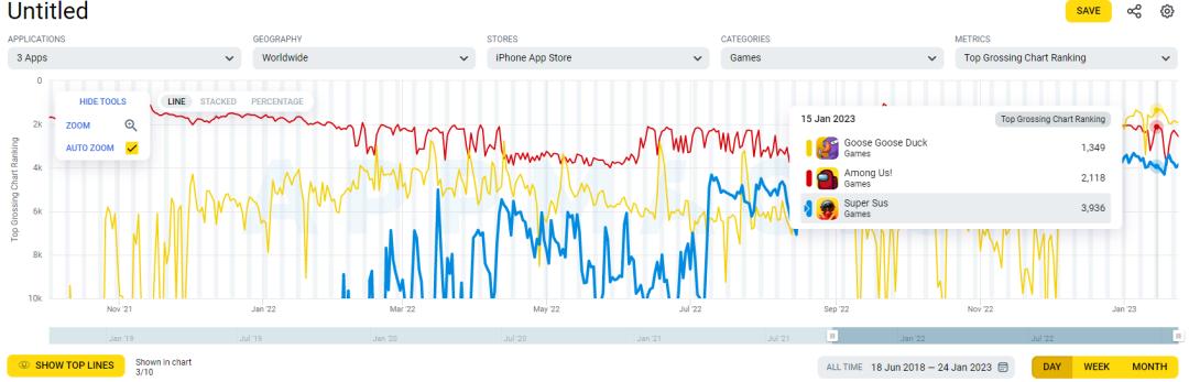 海外市场同为《Among Us》玩法有该游戏的同名手游,还有巨人的《Super Sus》和其国内版《太空行动》。巨人的《Super Sus》在海外南美和东南亚下载量较好,畅销数据较差。《太空行动》在1月15日上线后,曾首日新增破百万,但到了春节档数据反而下滑,即便如此,1月25日该游戏也位于iOS免费榜30位左右。