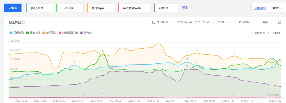 1月21日,《蛋仔派对》的百度搜索指数超过了其他四款热门游戏。在当日的某直播平台上,其热度为700万,也能排进手游里的前5位。