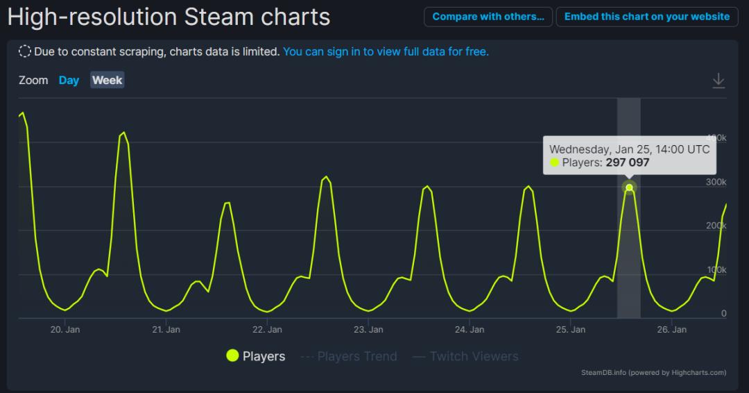 即便这座二线城市的多家网吧的网管都提到,《鹅鸭杀》热度一直有,每天都有人玩。但如此繁琐的游戏体验,确实跟半数以上网吧都在玩的《英雄联盟》和《穿越火线》形成了反差。1月15日起,国内直播平台纷纷限制该游戏的直播后,也让这款游戏的在线人数下滑。Steam DB显示,直播限制10天后,该游戏在线人数峰值降到了30万人次(1月23-1月25日)。