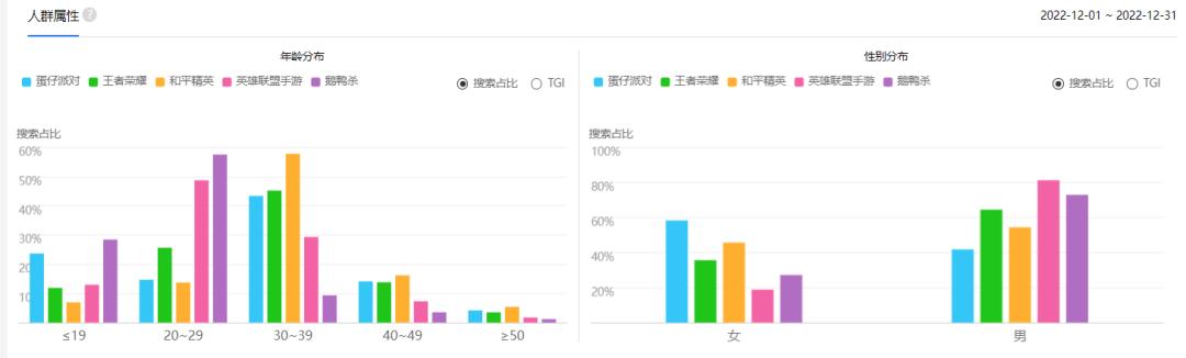 3.两款游戏的搜索占比里,小于19岁的人群比例较高,更容易传播形成高DAU。