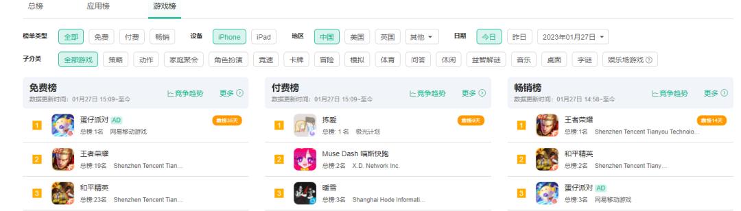 网易《蛋仔派对》在iOS免费游戏榜上霸榜34天(截至1月26日),并且在12月推出新的皮肤后,畅销榜连续攀升,从1月21日(除夕)开始进入iOS游戏畅销榜前四位。