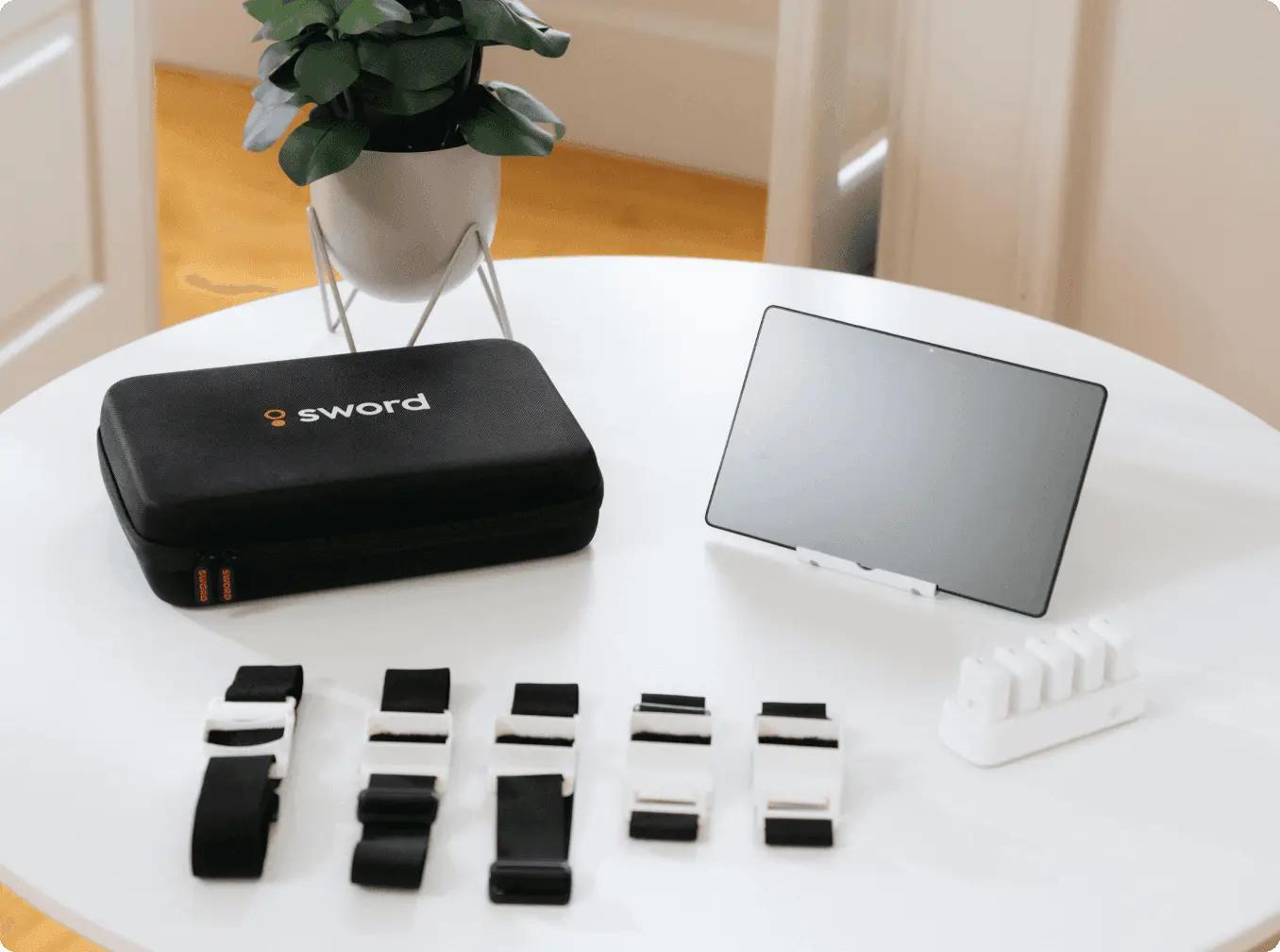 SWORD+包含装有应用程序的平板电脑和运动传感器。该运动传感器由SWORD自主研发,每秒可捕获超过25次测量,比人眼精确4倍,因此可做到实时精确的反馈,患者在家中即可完成康复计划。SWORD+具有三项功能,分别为ASK a PT™,Digital Guardian™和Academy。