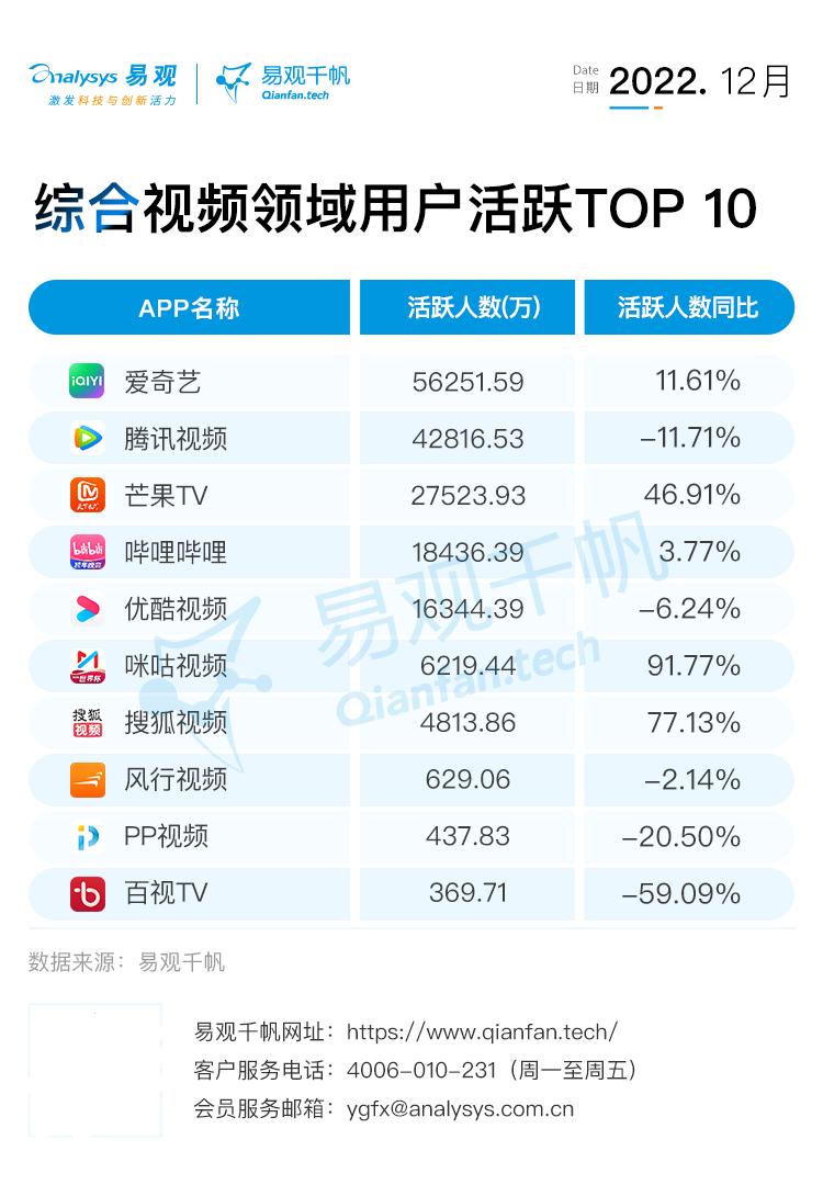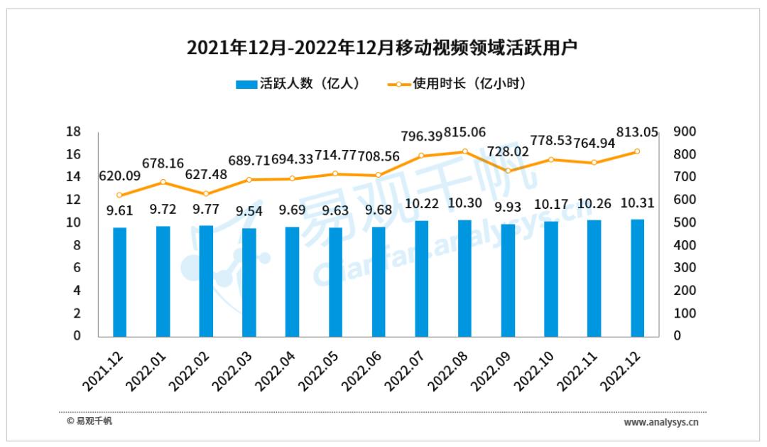 随着卡塔尔世界杯进入后半程,中国在线视频领域12月活跃用户规模持续向稳,易观千帆数据显示,12月中国在线视频活跃用户规模10.31亿,达到2022年全年最高值,同比增长7.24%,而用户使用时长达到813.05亿小时,增长更加明显,同比增长31.12%。