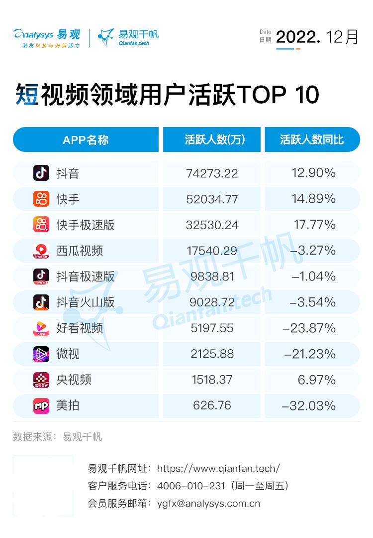 细分行业方面,各平台领域活跃用户人数环比增长比11月更明显,其中,综合视频平台12月活跃用户人数9.08亿,环比增长1.94%,同比增长7.85%,短视频综合平台12月活跃用户人数9.36亿,同比增长11.62%。综合视频平台和短视频综合平台活跃用户人数均达到全年最高值。