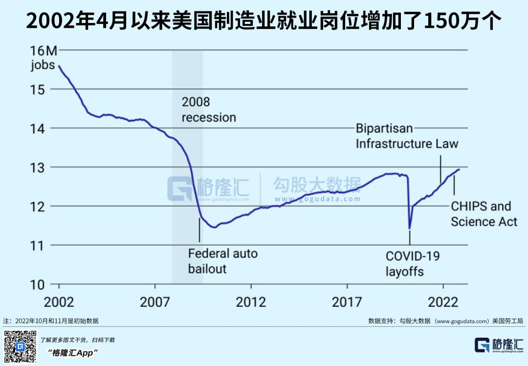 美国政府近年来出台的一系列鼓励制造业回归的政策正在落地见效,截至2022年11月,美国制造业的就业岗位总数达到了1290万个,这一数字突破了自09年以来的最高水平。从20年4月以来就业岗位增加了150万个。