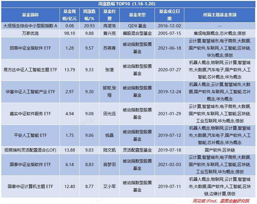 从涨跌幅(A/C基金以A类或排名靠前为准,QDII美元/人民币以排名靠前为准)TOP10中QDII型基金1只,主动权益型基金2只,剩余全部为指数型基金。整体涨幅回升至2.68%,环比+1.58pct。最高涨幅大幅上涨14.98pct至20.93%,为大成基金旗下基金。