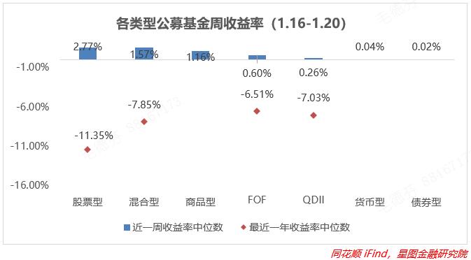 节前全部类型的基金收涨。股票型基金收益率中枢最高,节前A股、港股表现不错,所以仓位与之高度相关的股基、混基分别涨超2%、1%领涨所有类型的基金;FOF型、QDII型基金环比涨幅收窄,环比-1pct以内,依旧维持正收益;商品型环比+0.78pct,涨幅位居前3,黄金、原油是主要推手。最近一年收益率中枢中除了货币型、债券型基金外其余类型基金都在改善,且幅度都比较大;债券型基金年收益率中枢环比跌幅最大,环比-0.22pct,领跌所有基金;货币型基金变化不大。