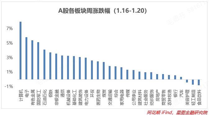 从板块来看,节前28个一级板块实现上涨,环比增加7个板块,上涨行情势头重新回暖,赚钱效应不错。涨幅靠前的聚集在信创、上游资源以及制造领域,包括计算机、电子、有色金属、国防军工等,均涨超5%,此外石油石化、钢铁则涨超3.5%。春节前周表现较好的消费领域垫底,食饮、美容领跌,不过跌幅在1%以内,汽车、农林牧渔、商贸零售涨幅也比较靠后。整体来看,节前有19个板块出现改善,环比增加9个板块,18个板块连续收涨,A股行情较强。