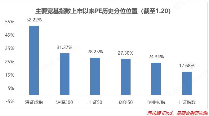 从上市以来分位值来看,节前几大指数估值进一步回升,而且修复力度同样比较大。主要由于节前权益市场表现继续回暖,外资大幅流入。上涨的领域较多,此外2023年已经确定为“复苏年”,叠加海内外一致看好中国资产,市场给予的估值也再度修复,带动核心指数上行。但是中大盘修复力度不够,深证成指、上证指数环比仅+2.5pct左右,其余指数均在4pct-9pct之间,差距较大。不过除上证指数外其余指数估值分位数均来到25%左右及以上;深证成指的估值超过50%。