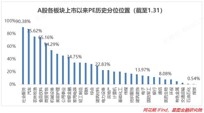 从上市以来板块分位值来看,截至1月31日收盘,28个板块估值实现上修,估值分位数平均回升2.77pct。机械制造、地产链、泛消费修复力度最大,机械设备、基础化工、计算机、建筑装饰、家电、国防军工环比+6pct以上;预期已过的商贸零售、美容护理估值走低,均回撤超1.2pct;部分上游能源资源估值修复力度依旧较小,平均在+0.73pct左右。板块估值中位数为房地产(22.48%)。