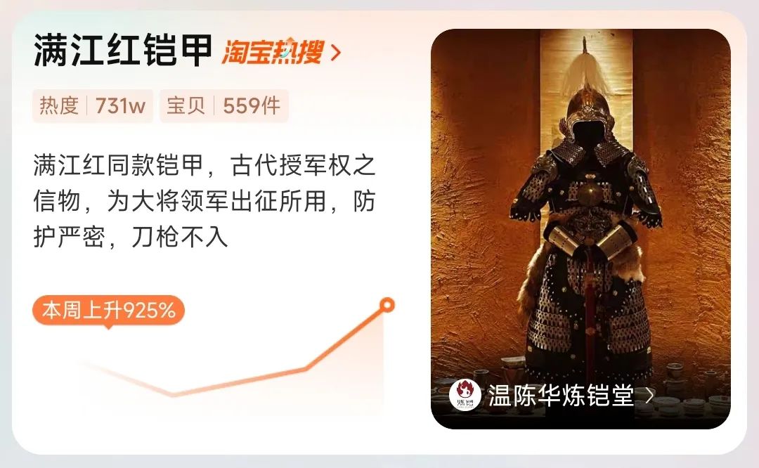 春节期间电影《满江红》热映,也带动《满江红》字画热销,《满江红》中演员身上穿戴的铠甲,顺势成“淘宝热搜”。背后店铺“温陈华炼铠堂”的创始人温陈华对记者表示,热搜肯定会带来网店日访客规模的增长,但对甲胄这样的高单价商品来说,热度转化为销量,应该还需要一点时间。
