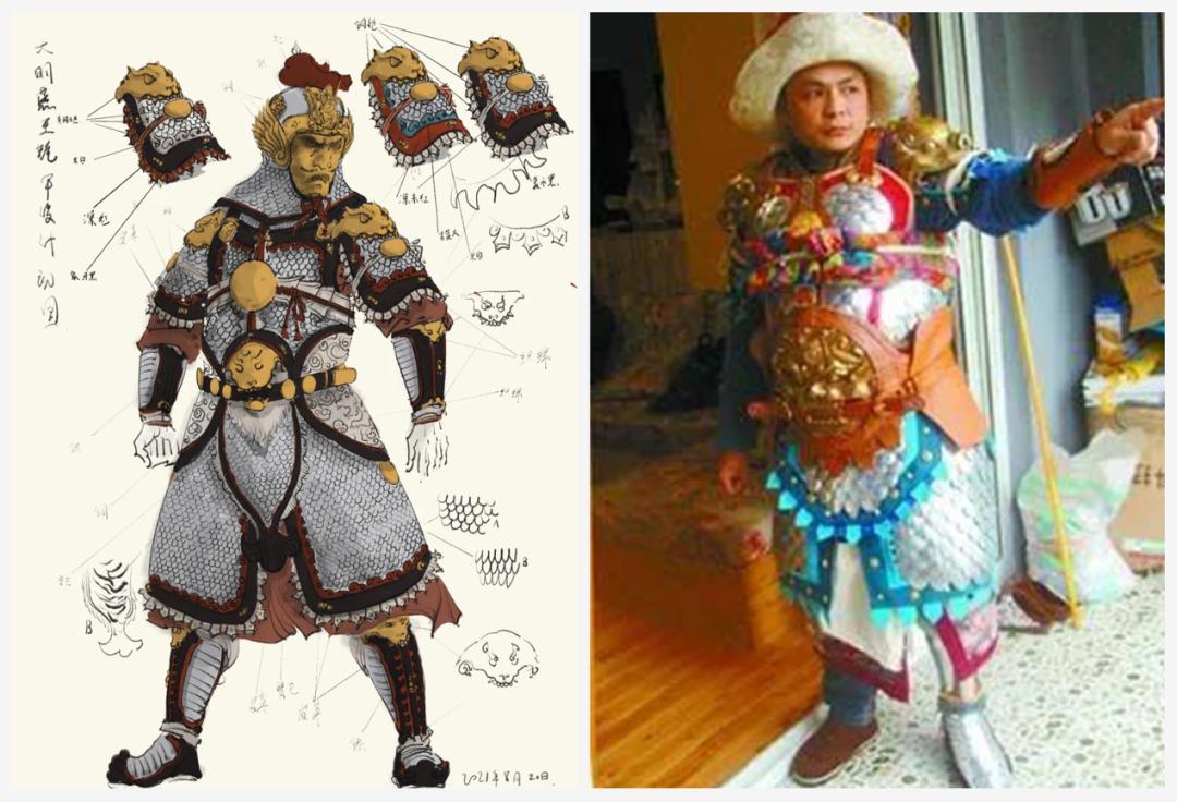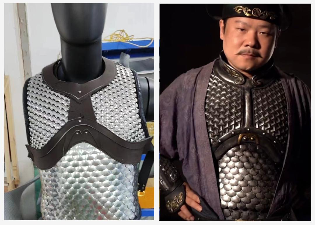 “合作的契机,其实源于在圈内积累下的人脉和口碑。同时剧组是带着比较完整的设计来的,我们主要负责生产铁制部件,如甲片、胸甲,其它部件由别的商家负责。”谈及与《满江红》剧组的合作,温陈华坦言自己的定位,更接近于供应商。自己交付的也并非成品,剧组有进行后期加工。“岳云鹏这一套也叫‘衷甲制’,其中胸甲是我们做的,肚子部位用到了鱼鳞甲,胸口用的是人字形甲片。甲片的包边,剧组应该有重新设计调整。”