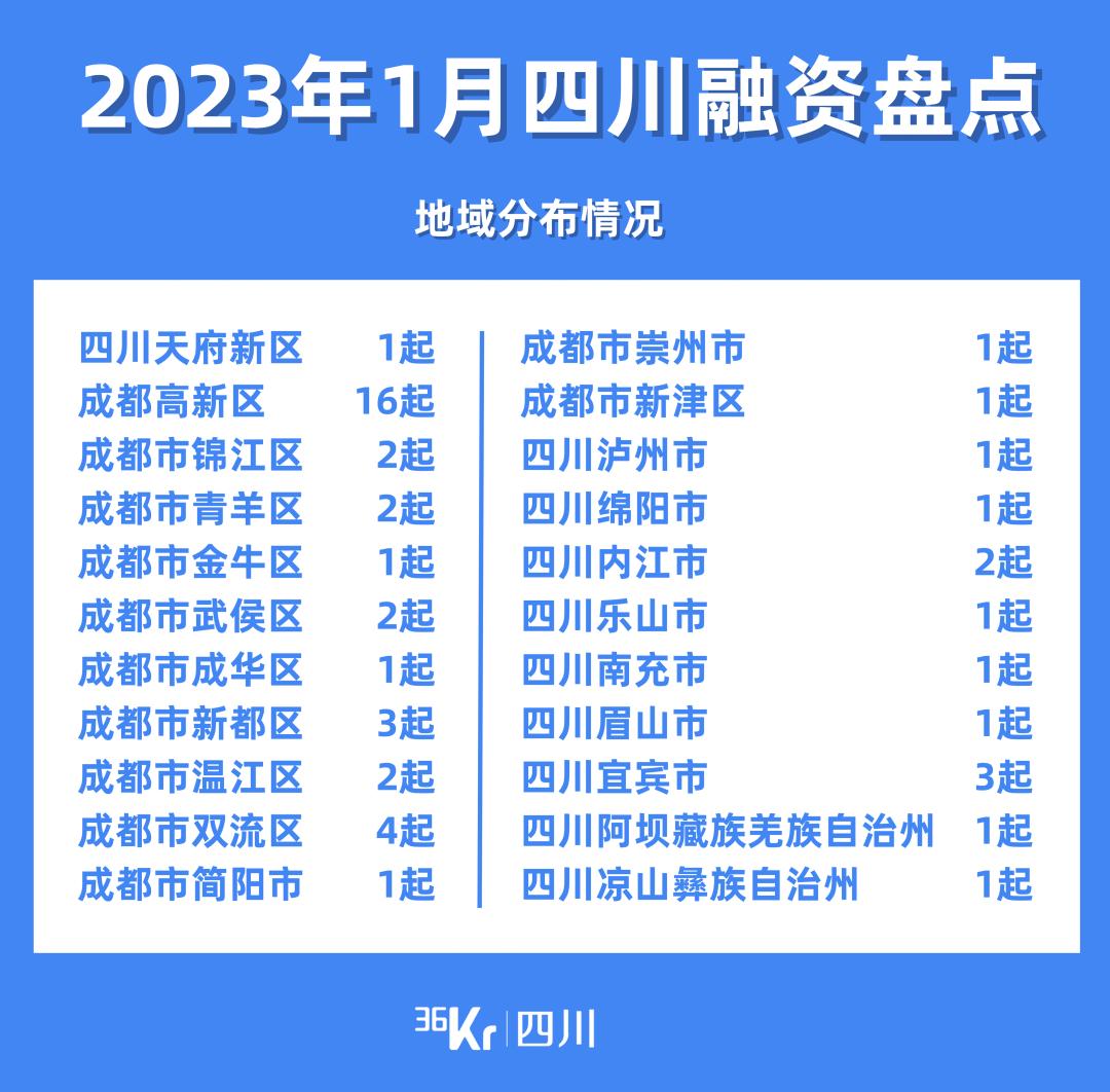 2023年1月,36Kr四川通过公开渠道,共收录与四川相关的融资、上市等事件49起,涉及相关企业48家。