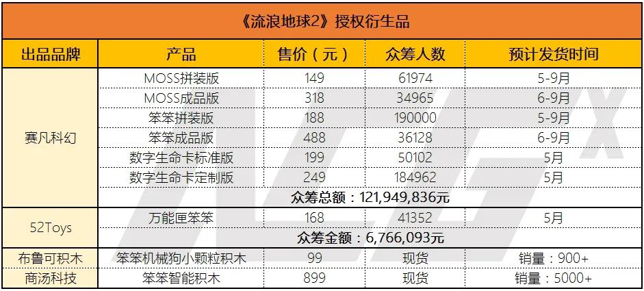 随后两年《流浪地球》也陆续有衍生授权合作,但要不就是众筹刚刚过及格线,要不众筹都完成不了。基于科幻题材大背景,《流浪地球》里的要素在衍生品领域是具备可开发性的,但是相较于国外成熟的科幻IP,《流浪地球》缺乏的是可以开发成爆款衍生品以及可持续开发的内容。特别是衍生品的可持续开发,对于IP的影响力延续至关重要。