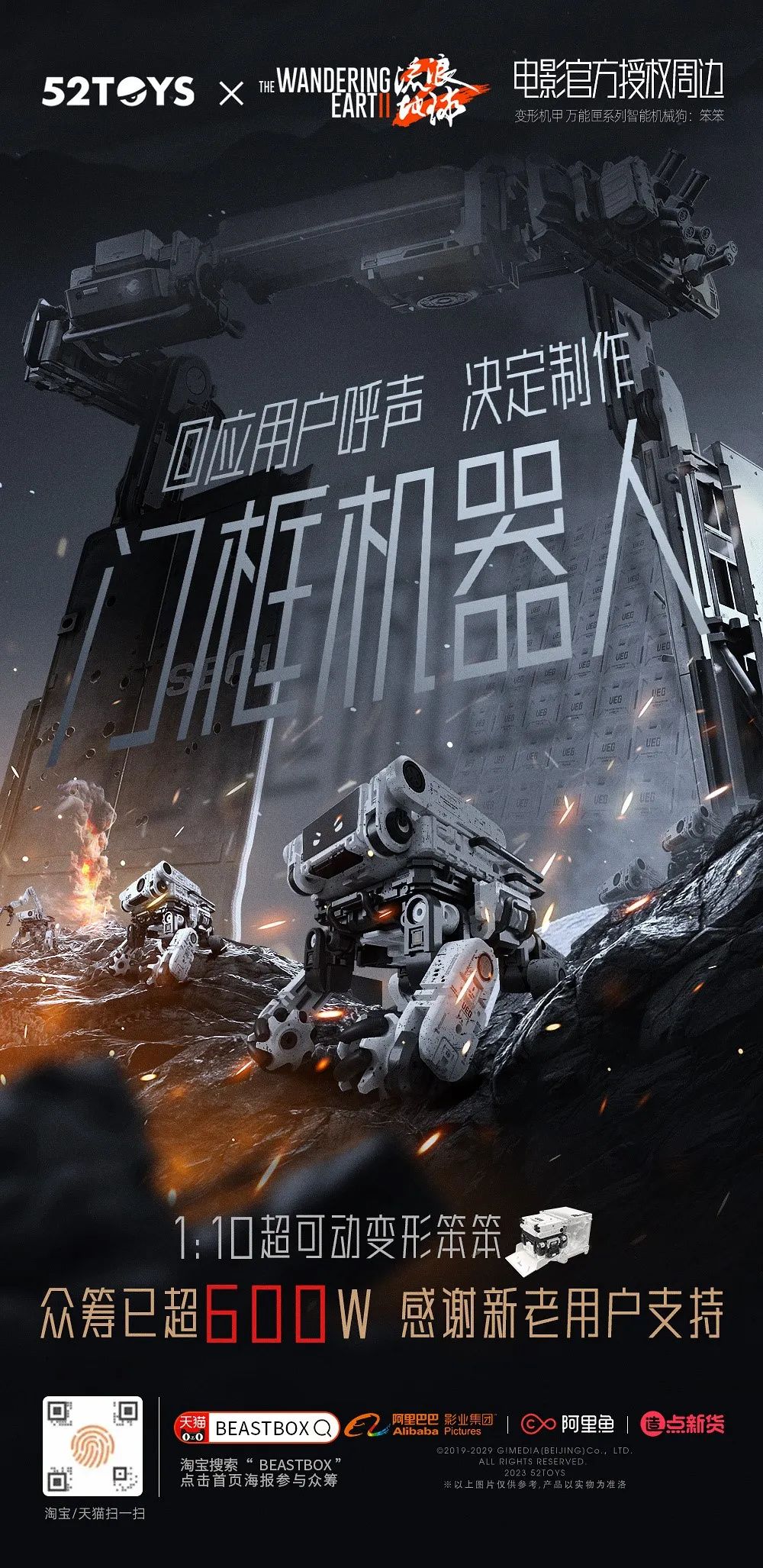 衍生品是粉丝情感投射的对象,笨笨的衍生模型成为了各个品牌合作的重点商品,这显然是在《流浪地球2》剧本创作阶段就已经构思好的,相较于影片中其它笨重的机械体,笨笨的机体结构相对简单,这使得衍生品开发时用入门级模玩产品复原电影里的笨笨有了可能。不只是笨笨,门框机器人、掠夺者无人机都有较广的开发前景,52Toys也于2月1日在官博公布要开发门框机器人的衍生品模型的消息。