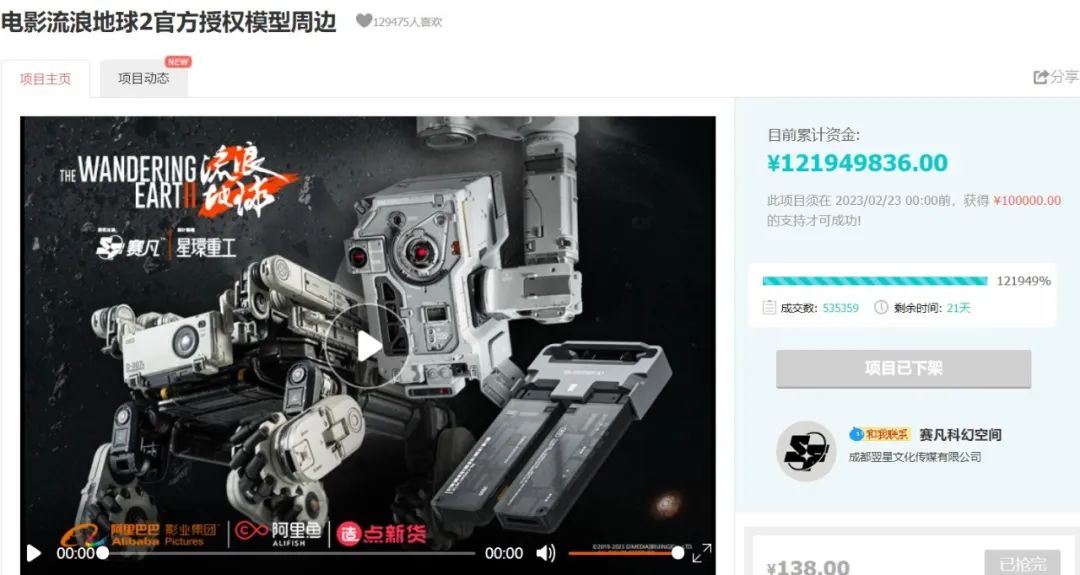 电影上映期间,衍生周边开发品牌赛凡科幻在淘宝“造点新货”众筹的《流浪地球2》授权模型周边,因为屡创国产电影IP衍生销售额新高,受到市场的极大关注,赛凡科技则呼吁观众们“快乐观影,理性消费”。目前众筹已提前结束,众筹金额超过1.2亿元。