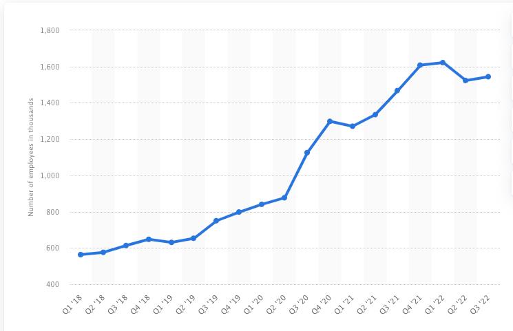 亚马逊员工数增长曲线 | 图源:Statista