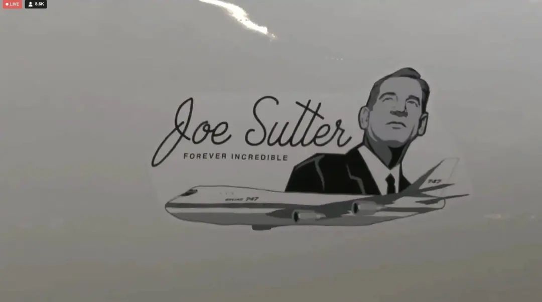 这是 1 架 747-8F 货机,右前方贴有纪念波音 747 之父乔·萨特的贴纸。