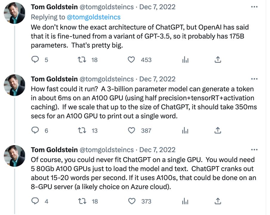 AI学者Tom Goldstein曾算了笔账,按照ChatGPT是基于GPT3.5的说法,它的参数量可能为1750亿。因此大约需要5个80GB的A100来加载模型和文本,ChatGPT每秒钟能产生大约15-20个单词,如果它使用A100,那么可以在8-GPU服务器上完成。