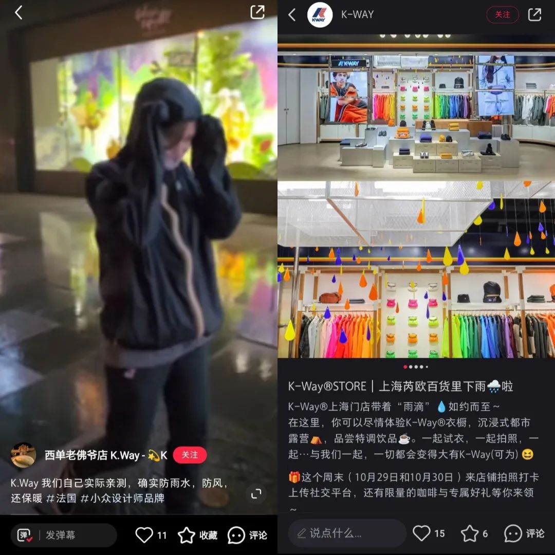 从小红书的种草帖子来看,K-Way主要应用的场景是都市或户外露营,主打的是具有防雨防风功能的时尚穿搭。比如,针对户外场景推出的“山系男/女孩”概念,以及露营场景的时尚穿搭。对于最重要的防雨防风功能,老佛爷百货店甚至拍视频亲测,称不仅防雨防风,而且保暖;芮欧百货店还专门设置了“雨滴”造型的美陈。